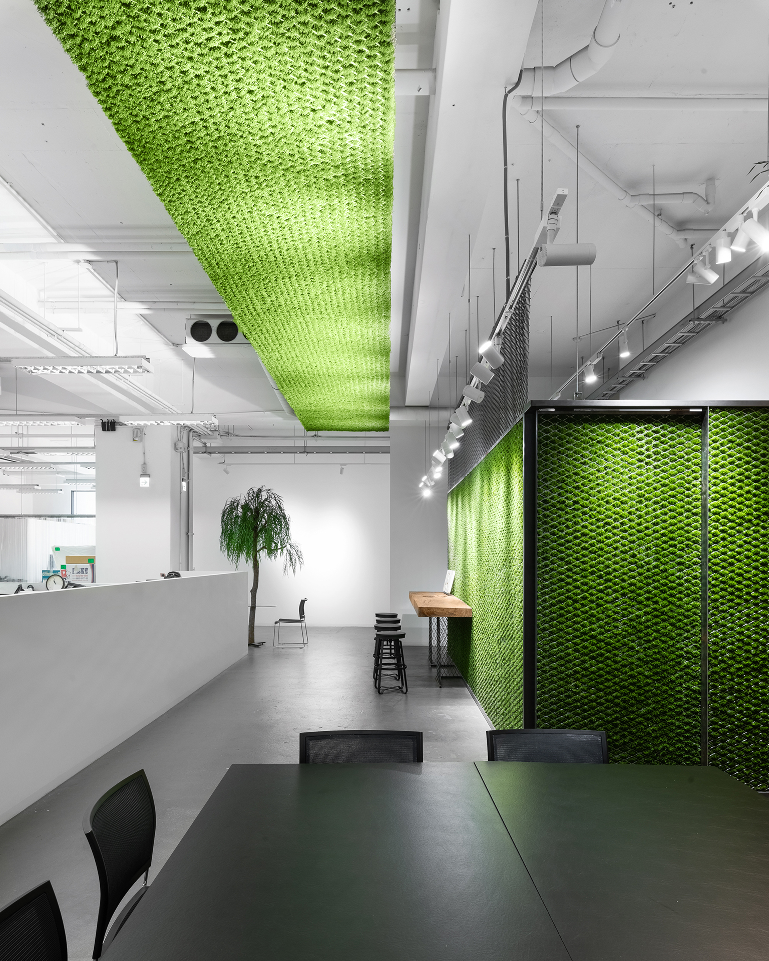 在空間中央的一個綠色盒子,是作為員工廚房和服務區的公共區域核心。金屬擴張網把草皮夾在中間形成綠色圍籬,既是草皮的結構,也是其「框架」;呈現了讓草皮如薄紙般漂浮在空中的效果。漂浮的草皮、一個種植真實樹木的大型花台、滿載人工植栽的格架和以真實樹幹支撐的玻璃桌子皆創造了混合幻實的綠意環繞著這個中央區域。另外,公共區域還設有架在「幻影」般金屬擴張網架上的沉重原木吧台與共用餐桌。而原型設計區域則設在公共區域末端,以通常使用於倉庫的半透明工業條形窗簾給間隔開來。