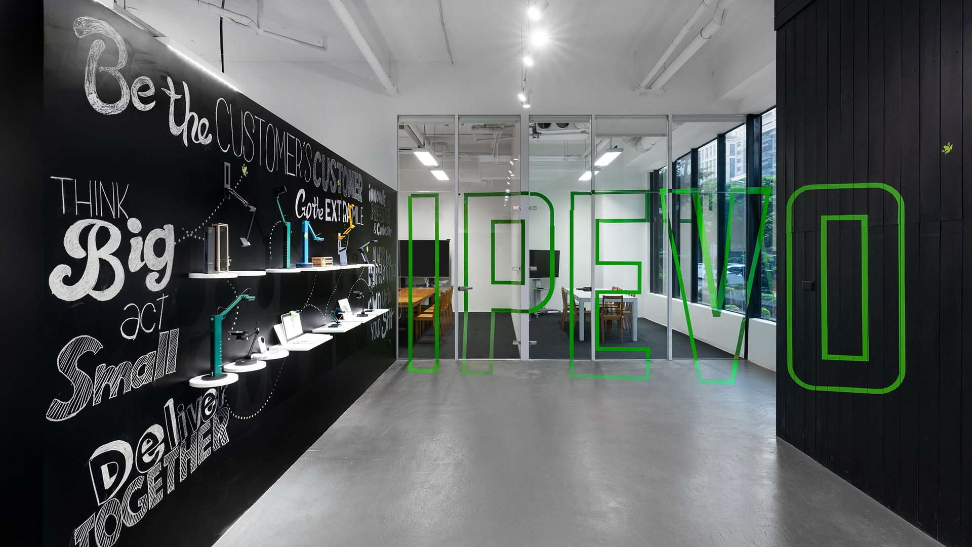 在大廳當中,企業標誌經散化後投射到遠端會議室的門窗和牆壁上,只有在接待處的特定位置上才會看到一個完全的整體。黑板牆為公司產品和用戶故事提供了一個變化不斷的畫布,而其白色的展示架,其實是摩斯密碼形式的公司名稱,則是另一種視覺感知的空間發揮。