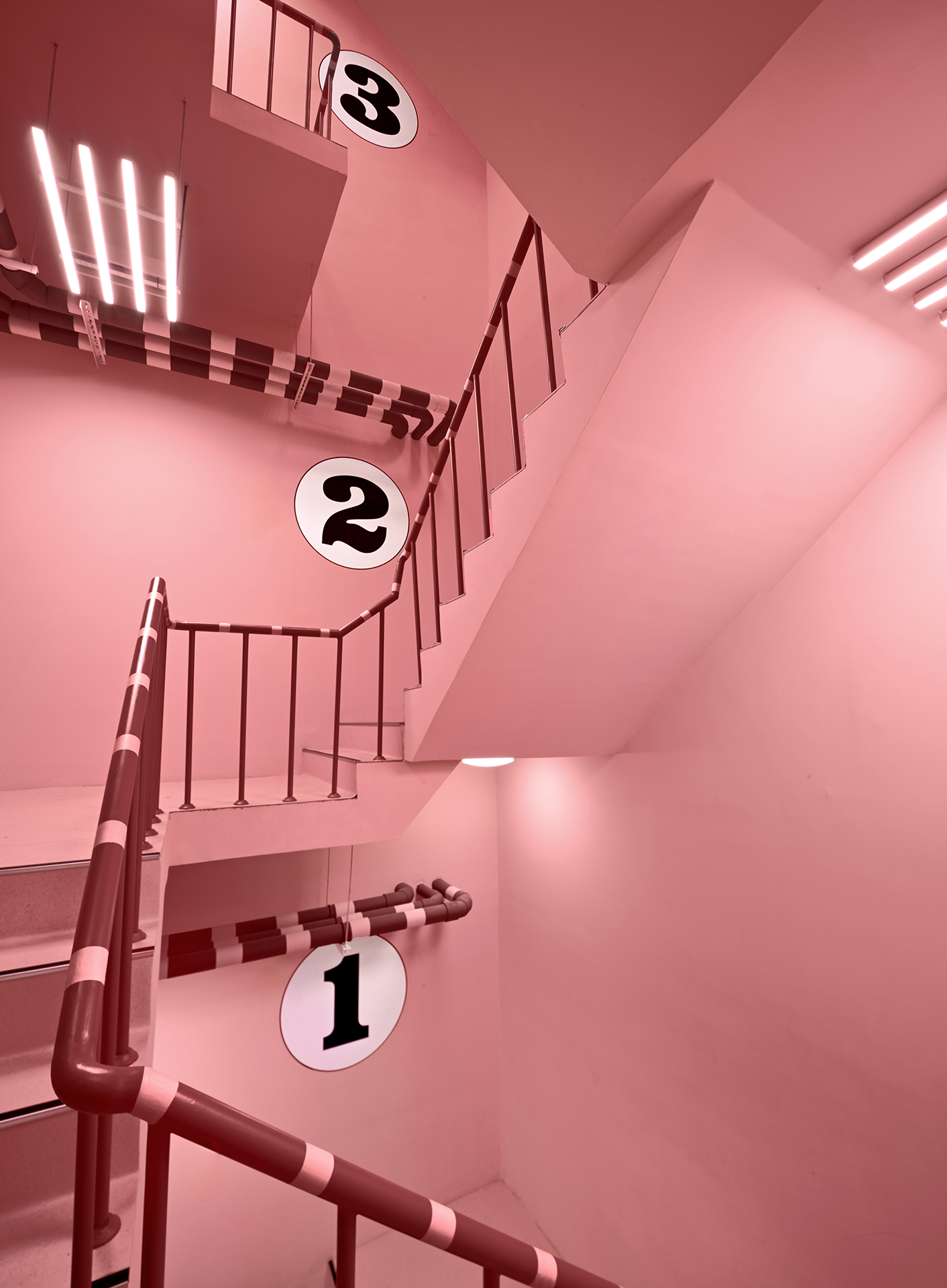 紅藍白的Martini 賽車塗裝、紫綠色的Psychedelic 利曼賽車圖騰,以及藍橘色的Gulf 塗裝; 這些最經典獨特的色彩組合在過去幾十年裡早己與保時捷聯繫在一起,成為其賽車傳統和品牌識別的重要元素。設計利用常見於水族箱中的工業玻璃珠將這些經典的保時捷賽車圖騰轉化為奪目的翩翩光影的「彩蛋」潛藏於空間中,有待汽車文化發燒友們發現,或為初來乍到者提供破冰話題,旨在凸顯這些保時捷圖騰的文化意義。而最具標誌性的圖騰— 粉紅豬Pink Pig— 被轉換成串連駕駛中心至賽道最奪目的粉紅色樓梯,讓車迷上賽道前驚喜滿滿,能量沸騰。