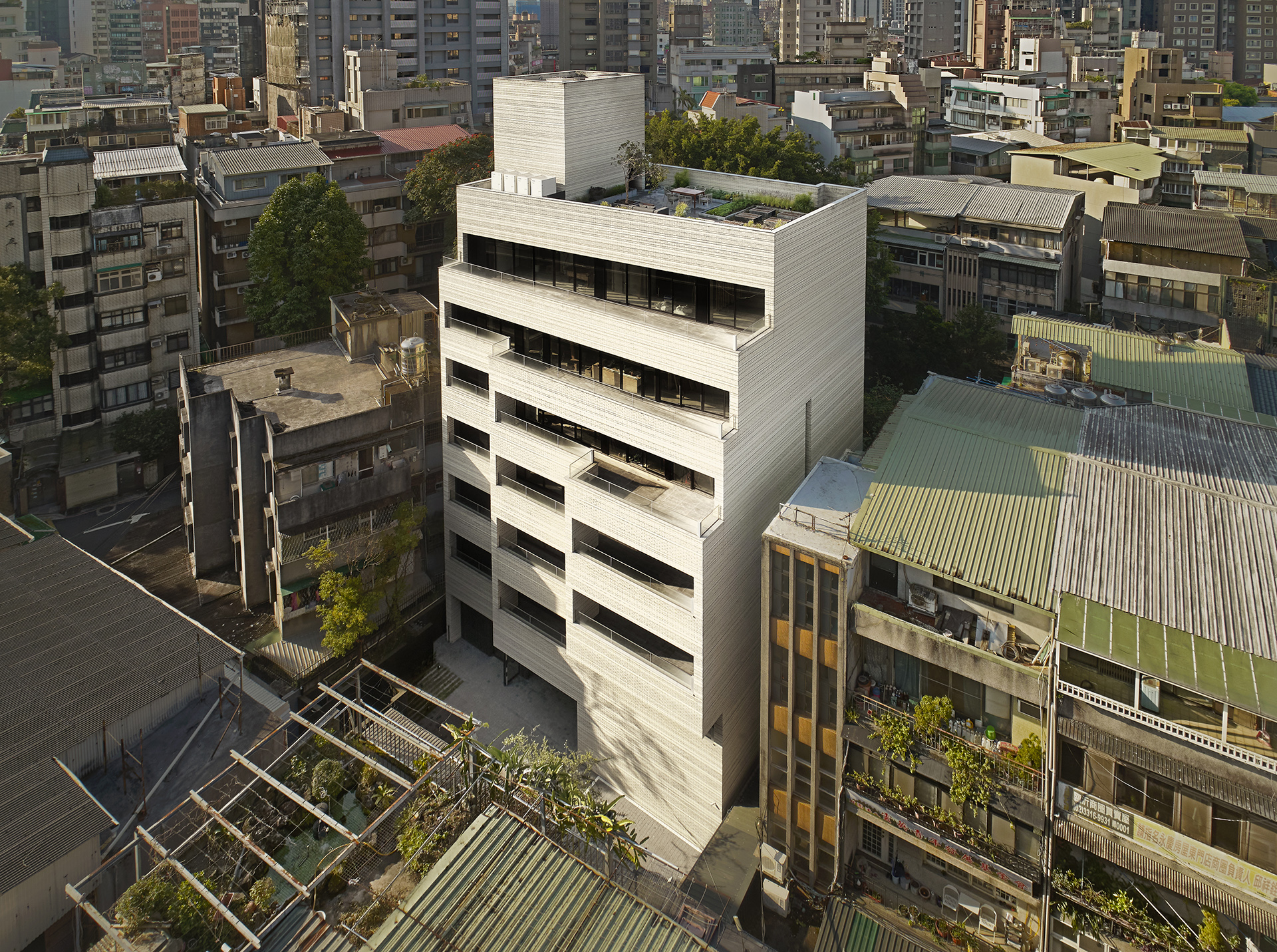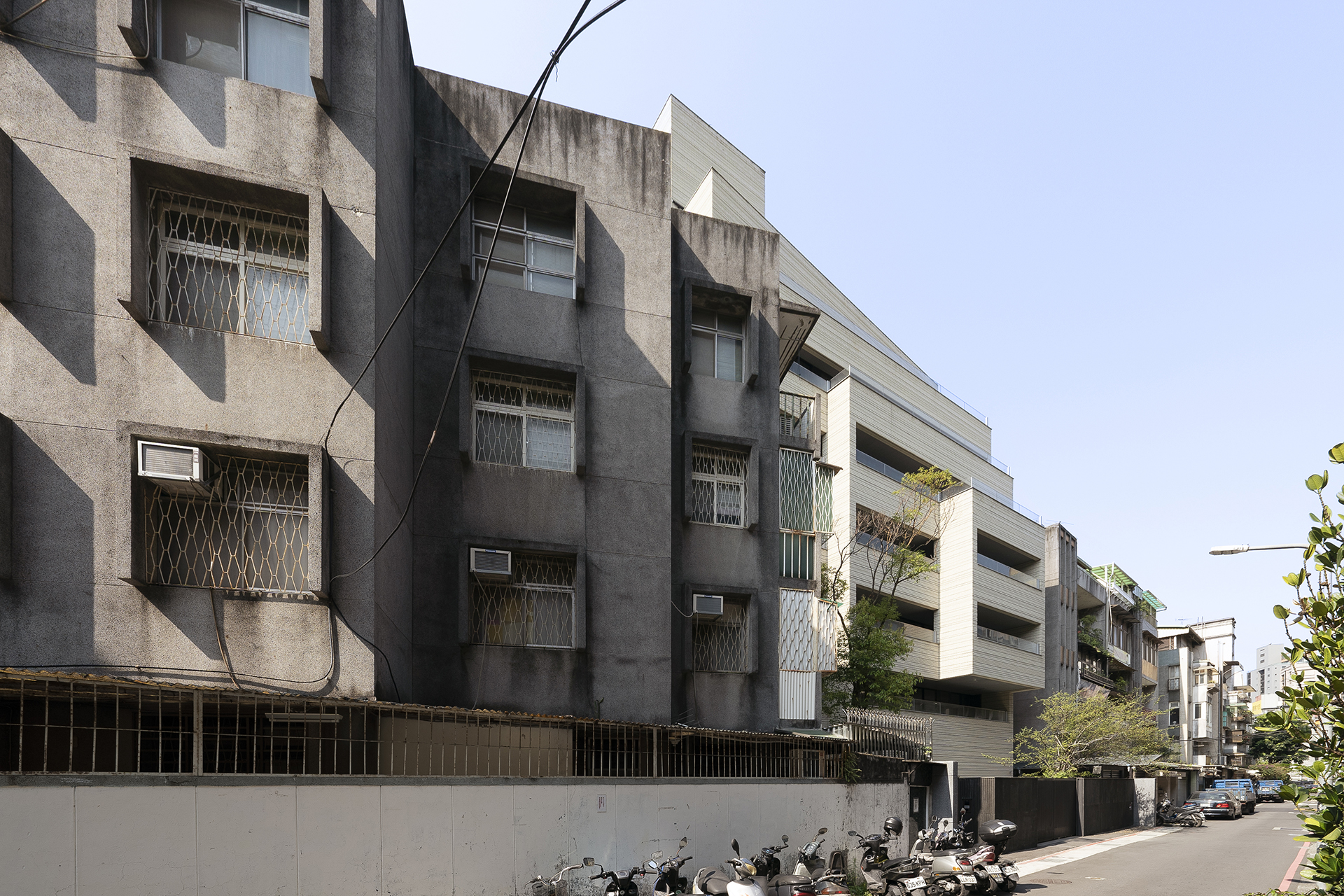 位於台北市中心、一個蜿蜒小巷中的高密度住宅區的六戶集合住宅,以兩大創新要素顛覆了台灣都市住宅慣例的形態。台灣深受風水文化的影響,住宅設計特別要求方正的平面格局,忌諱室內有凸出的落柱或在主要空間有大樑穿過。再加上由於成本較低,混凝土框架系統通常是中小型住宅的首選建築工法,因此一般慣例是把水泥樑柱框架拉到住宅牆外,顯現台灣住宅格子狀結構外露的外貌傾向。加上建築法規允許固定比例的雨遮、陽台與花台等突出物不必計入容積,卻又可作為計價面積來銷售,因此,外露格子狀的混凝土結構大樓量體、再外加上各式如藤壺般的突出物外觀,形成了本地住宅獨特的「格子加顆粒」樣貌公式。